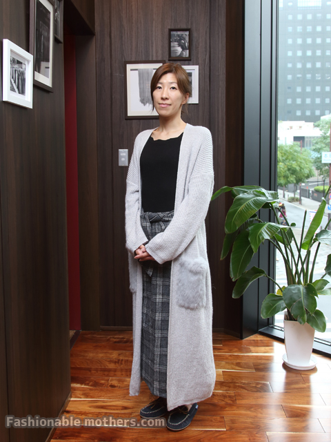 ロングカーデ+チェックのマキシスカートでスタイルの良さを際立たせるIラインコーデの完成ですね。